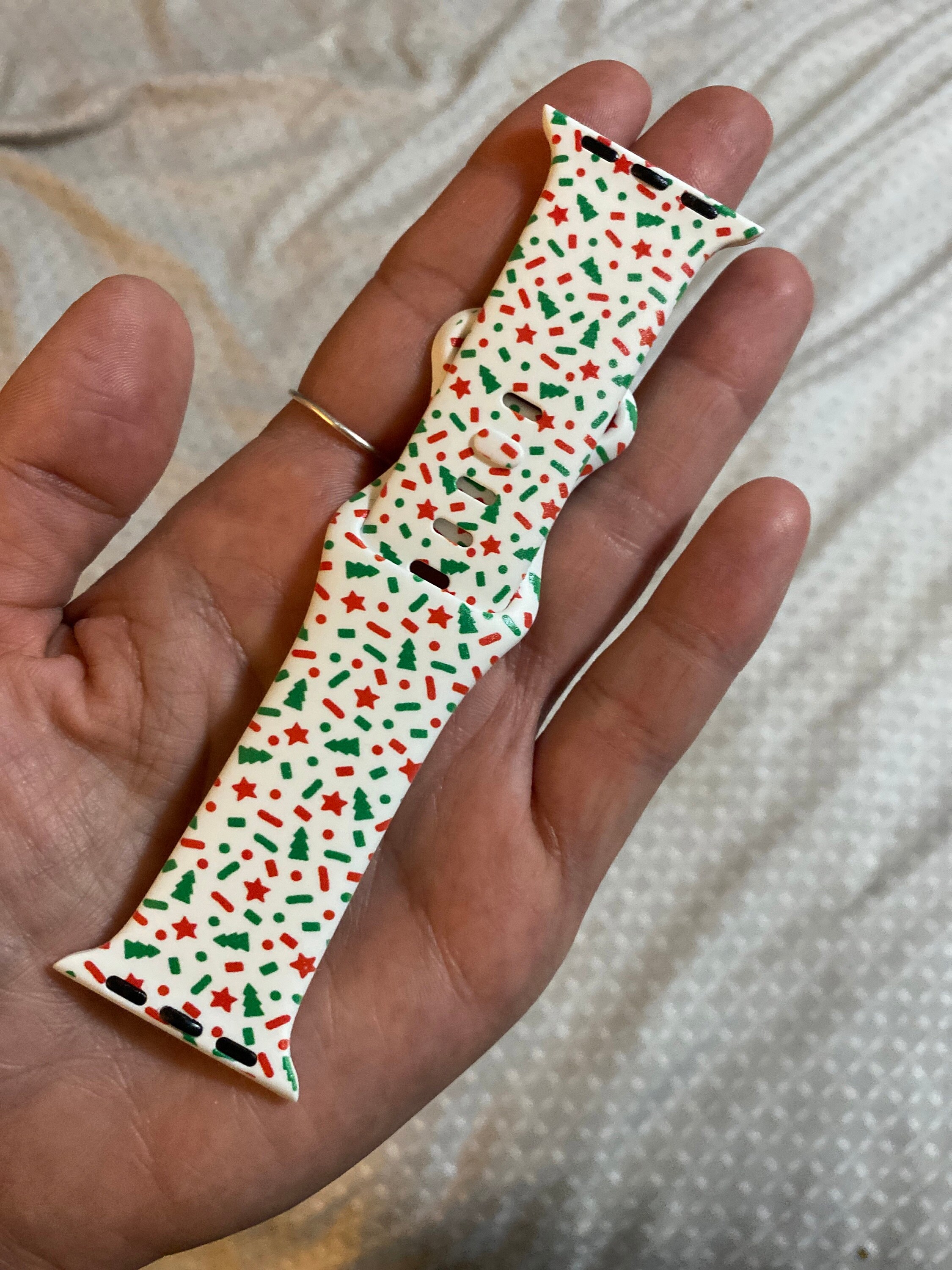 This is a fun Christmas Watch Band compatible with Apple watches designed and made in-house (unlike other sellers - who sell handmade in china), using TPU silicone. Available for Apple watch series 1-7 Sizes 38mm 40mm 41mm 42mm 44mm 45mm